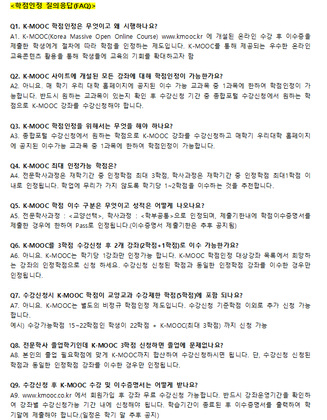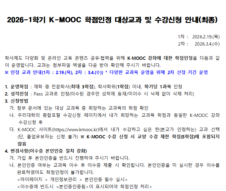 공지사항2026-1학기 K-MOOC 학점인정 대상 교과 및 수강신청 안내(최종)자세히보기